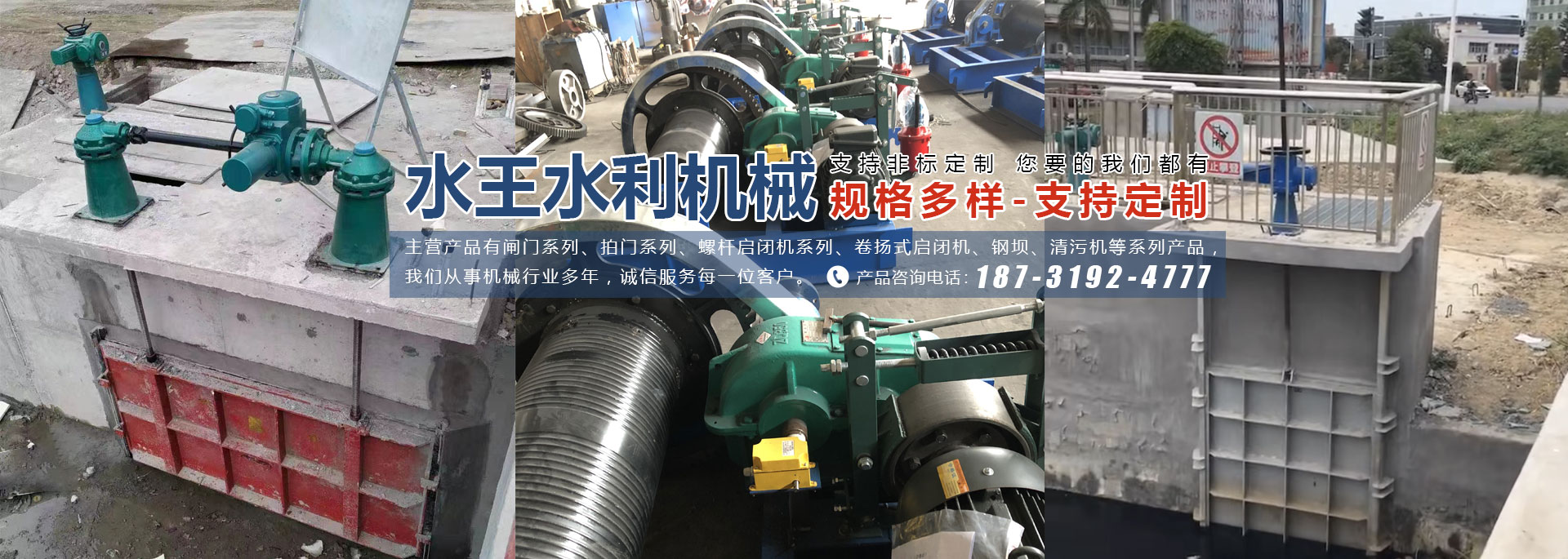 河北水王水利机械有限公司专业生产销售铸铁闸门、启闭机、闸门、固定卷扬启闭机、移动卷扬启闭机、电装启闭机、铸铁镶铜闸门、钢制闸门、翻板闸门、不锈钢闸门、景观坝、钢坝、液压翻板闸门、铸铁拍门、钢制拍门等各种材质拍门、橡胶止水的专业制造、生产及指导安装的综合性厂家,具有现代化管理模式,产品结构合理,性能可靠,确保向客户提供高质量的产品和周到的售后服务,是制造、销售、安装一体化的规模型水利工程机械生产企业。  主导产品:  1、螺杆式启闭···